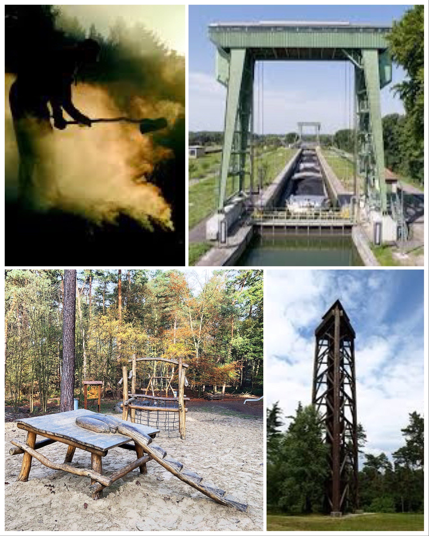 Die Wanderroute startet an einem abenteuerlichen Waldspielplatz "Am Dachsberg" in Flaesheim, führt zum Holzkohlemeiler, Feuerwachturm und zum Schluss vorbei am Café Brinkert zur Flaesheimer Schleuse, wo man das Einfahren und Anheben der Schiffe beobachten kann - ein Highlight für Kinder!