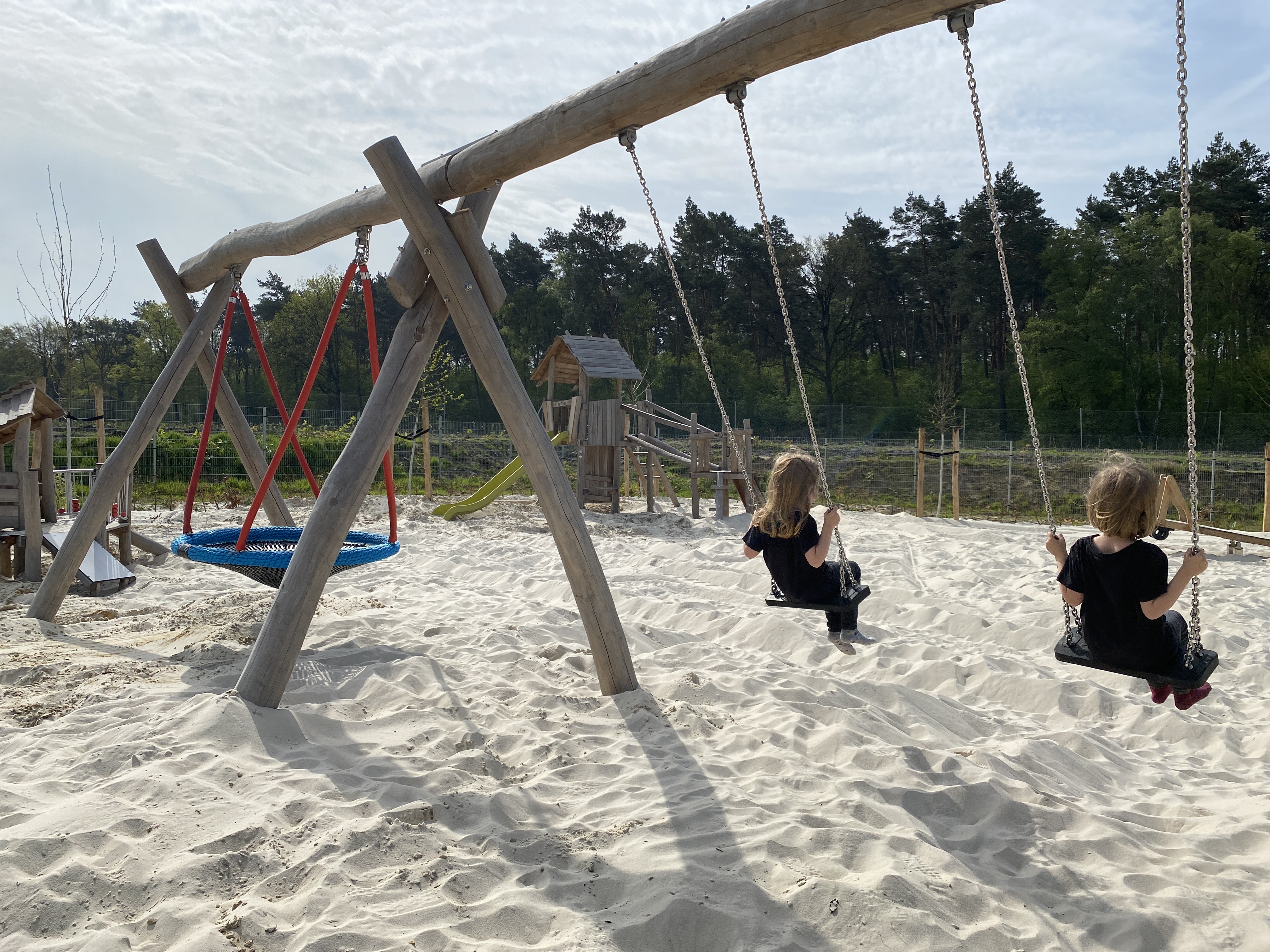 Unsere Erweiterungsfläche haben wir um einen großzügigen Sandpielplatz erweitert - hier findet ihr einen sonnigen Platz mit Klettermöglichkeiten und Rutschen für größere Kinder und Kleinkinder, Schaukeln, Stehwippe und Sitzmöglichkeit für die Eltern.